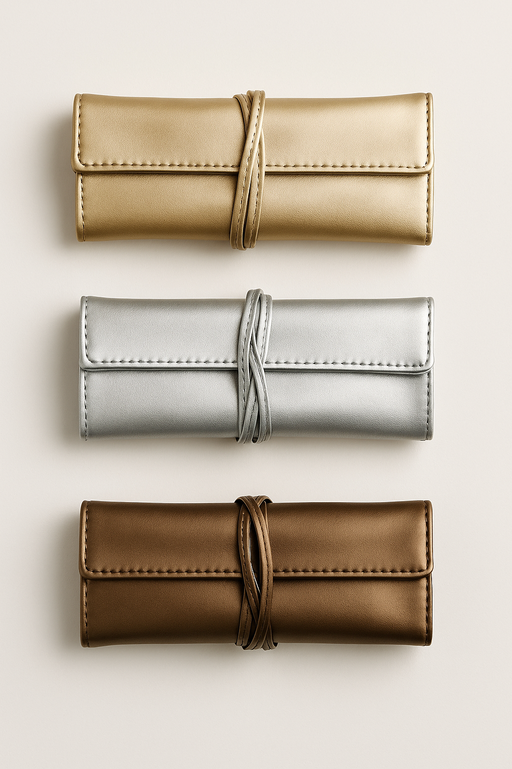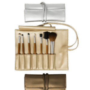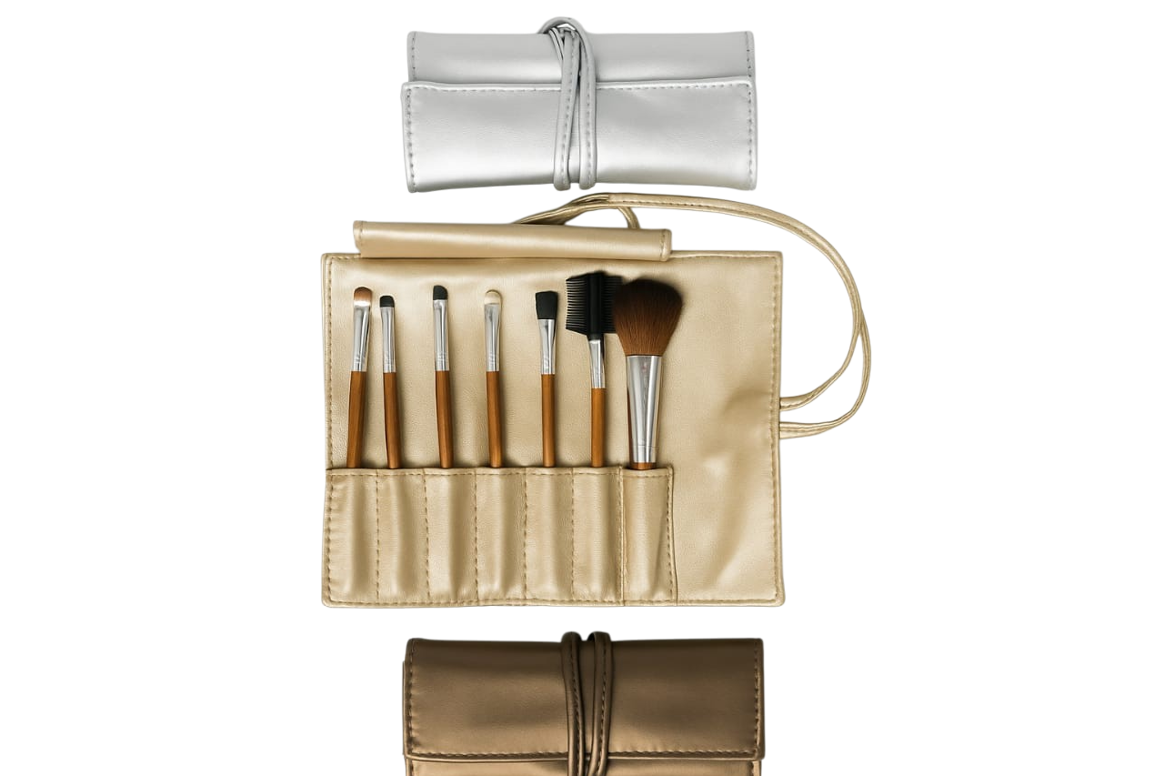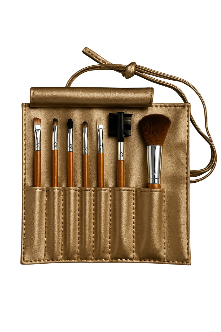 Crafted with soft, skin-friendly bristles, these brushes provide smooth blending and professional results every time. The stylish PU leather roll-up pouch comes in gold, silver, and bronze, keeping your brushes organized and travel-ready.