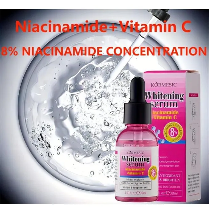 Kormesic Whitening Serum Niacinamide with Vitamin C 30 ml is a powerful skin-brightening formula designed to restore radiance and even out skin tone. Enriched with Niacinamide (Vitamin B3) and Vitamin C, this serum helps reduce dark spots, blemishes, and discoloration while improving skin texture. Its lightweight, fast-absorbing formula hydrates the skin and enhances its natural glow. Perfect for all skin types, this whitening serum provides daily care for clear, smooth, and luminous skin.
